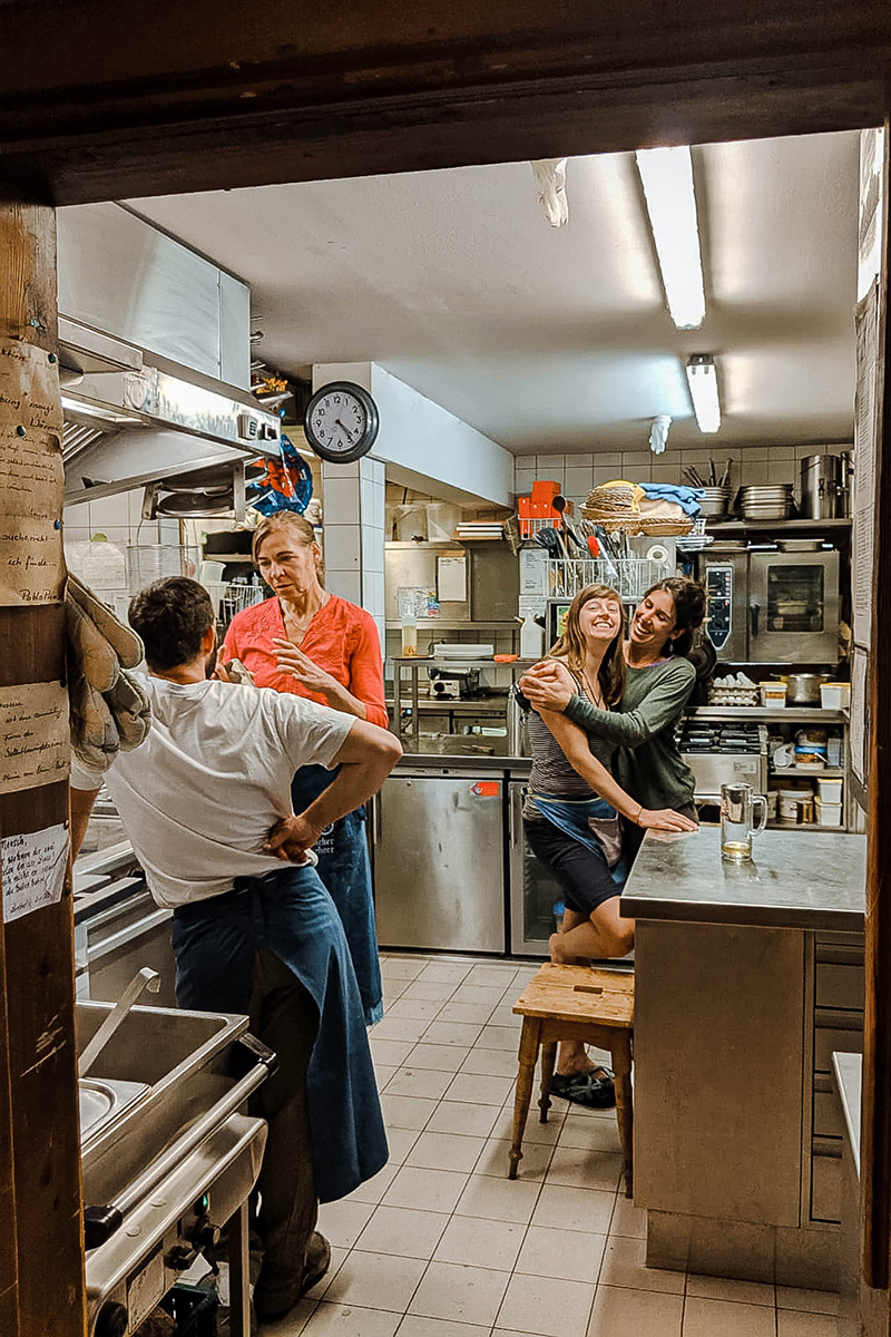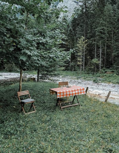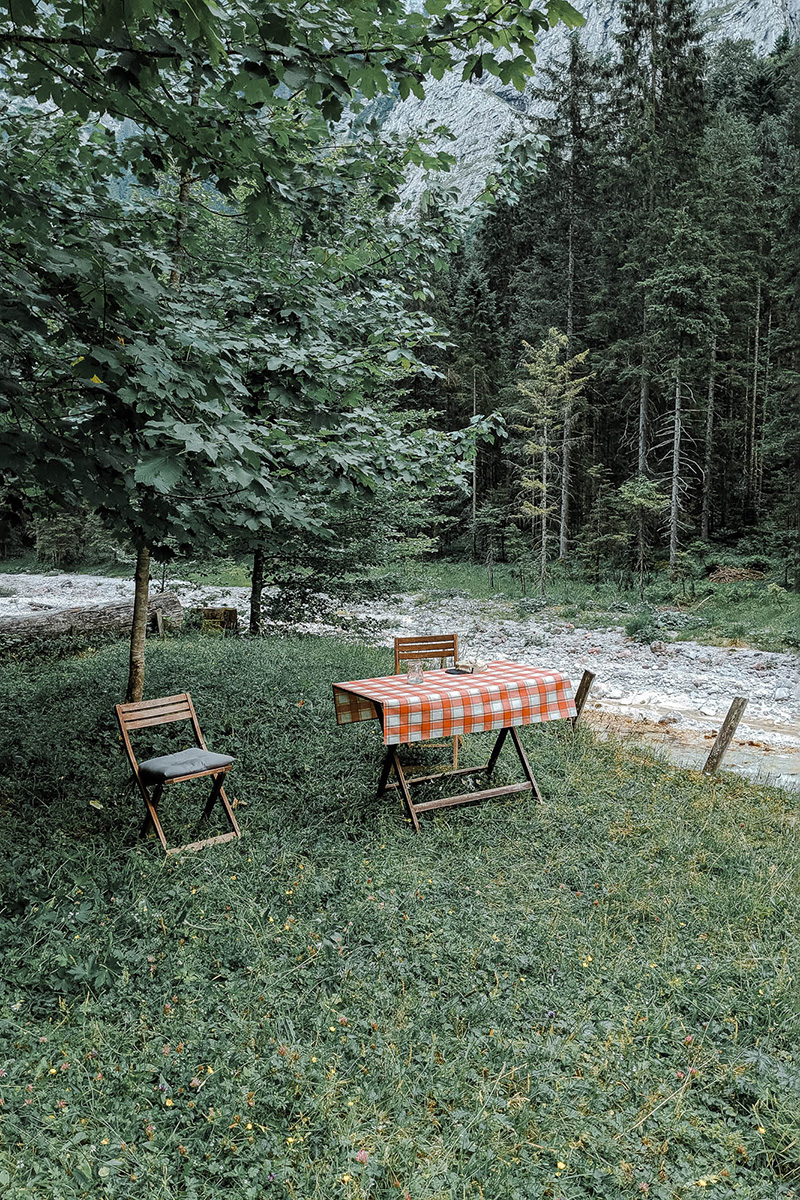Der kiesige Weg führt an wunderbar kalten Badegumpen vorbei bis zu dem Wäldchen das die Reintalangerhütte umschließt. Geborgen und entrückt liegt die Hütte direkt am weißen Bachbett der Partnach. Unter den bunten Sonnenschirmen des Lido, die dankbaren Füße im Wasser und das kalte Bier in der Hand, überkommt einen, ob man will oder nicht, ein wohliges Gefühl von Glückseligkeit.