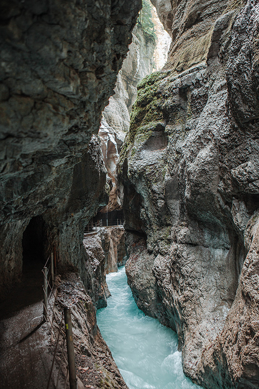 Vom Olympiastadion in Garmisch-Partenkirchen passieren wir die Partnachklamm, welche für sich schon eine spektakuläre Sehenswürdigkeit ist. Zwischen den bis zu 80 Meter hohen dunklen Wänden aus schwarzem, alpinen Muschelkalk toben die Wassermassen wie Berserker auf ihrem Weg ins Tal. Wir sind früh genug aufgebrochen und entgehen so den üblichen Touristenströmen.