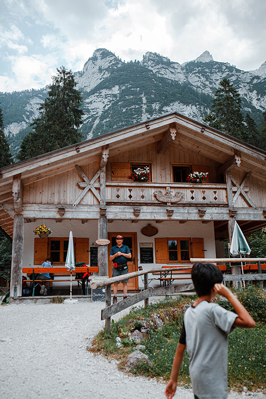 Kurz vor der Bockhütte, der Weg ist hier schon wesentlich schmäler, kommt die Abzweigung zum Schachen. Wer sich noch für die nächste anstrengende Etappe stärken möchte, macht noch einen kurzen Abstecher zur Bockhütte, die auch ein beliebter Zwischenstopp auf dem Weg zur Reintalanger Hütte und der Zugspitze ist.
