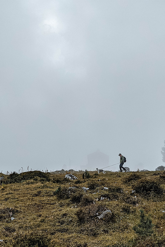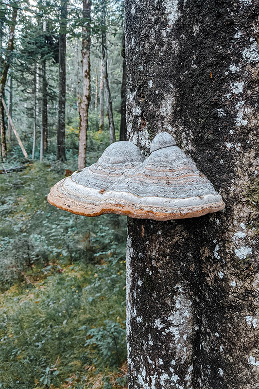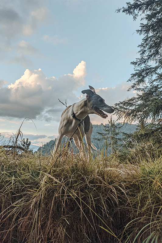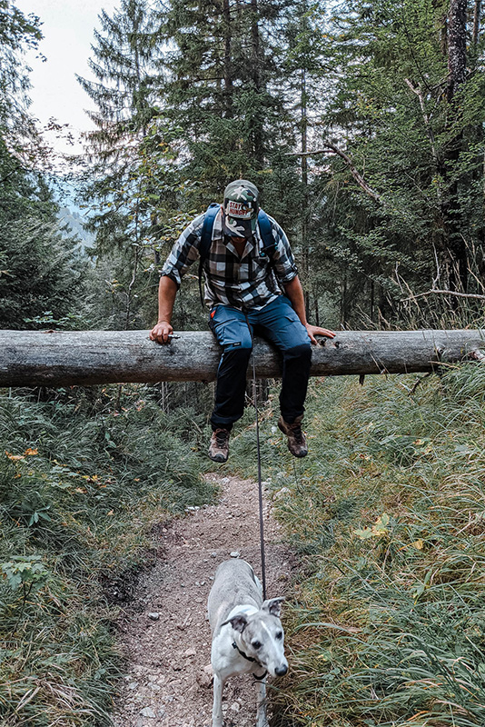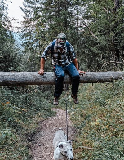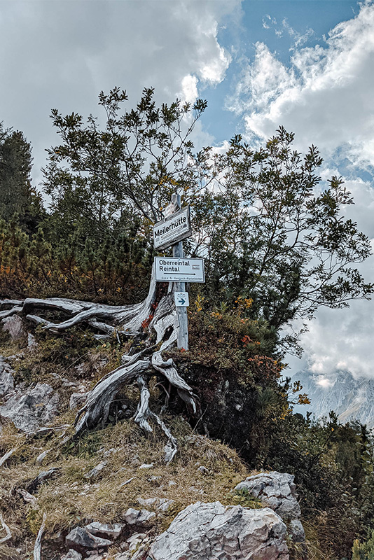 Weiter geht‘s dann erstmal über den Zirben gesäumten Königsweg, bis wir nach einer alten Hirtenhütte das Schachengatterl passieren. Hier zweigt nach einigen Kurven der Kälbersteig nach links, den Berg herunter, ab. Über Almwiesen, Wald und Lichtungen kreuzen wir immer wieder eine Forststraße, ehe wir nach dem letzten Waldstück die Weggabelung oberhalb der Partnachklamm erreichen.