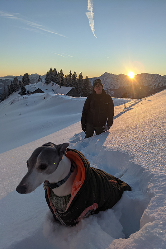 Momentan sieht man keinen der beiden Wege, da meterhoher Schnee die Pfade bedeckt. Um das Spektakel des Sonnenaufgangs weiter verfolgen zu können, versuchen wir uns an der Südseite. Glücklicherweise sind die Markierungen auf den Felsen auch im Schnee weitestgehend sichtbar und so erreichen wir nach vorsichtigem Aufstieg das Latschenfeld auf dem Roßstein und bald darauf die eingeschneite Tegernseer Hütte mit dem hinter ihr aufragendem Buchstein.