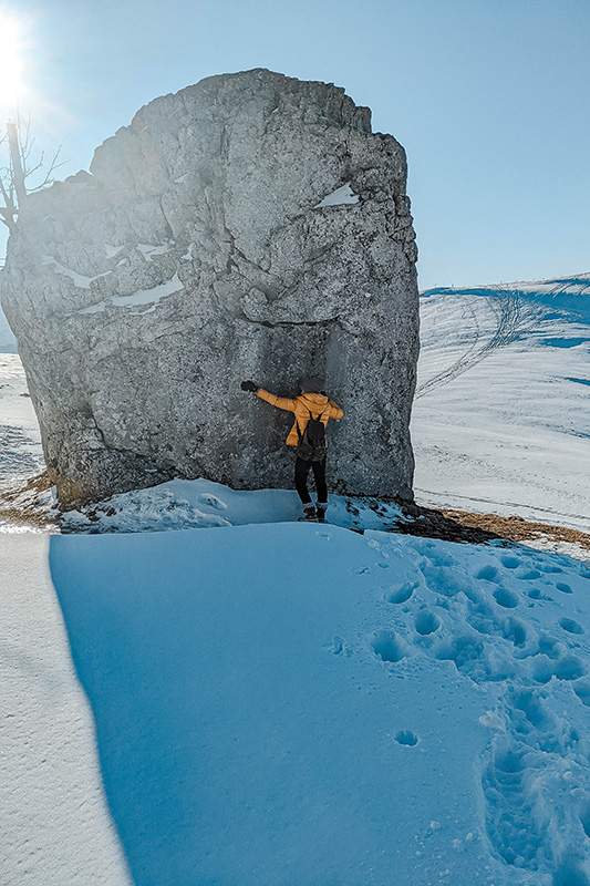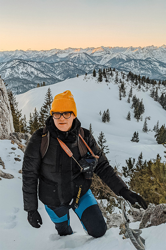 Wegen dem eisigen Wind verzichten wir auf eine Rast, teilen uns nur eine Tasse heißen Tees aus der Thermoskanne und versinken nach wenigen Schritten hüfthoch im Schnee. Da helfen nur noch Schneeschuhe mit denen wir uns links in weitem Bogen auf den steilen Südhang zuarbeiten. Der frisch geschlüpfte Morgenhimmel präsentiert eine breite Palette an Pastelltönen die uns bis zu einem markanten Felsen am Fuß des Roßsteins begleiten an dem ein Wegweiser uns zwei Möglichkeiten aufzeigt: Die vermeintlich einfachere, linke Variante lässt uns den Roßstein vom Norden her umrunden. Abenteuerlicher geht es rechts zu, wo der südliche, teils durch Drahtseile gesicherte Steig, über felsige Stufen zum Ziel führt.